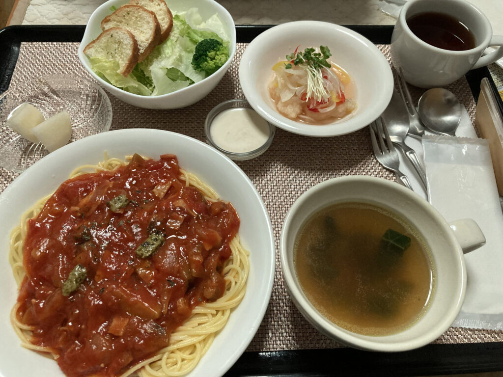 ナスとベーコンのトマトパスタ,エスカベッシュ,チーズのカフェサラダ,スープ&フルーツ
