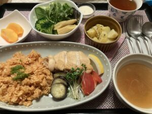 ケイジャンチキン,オーブンポテト,グリーンサラダ,ジャンバラヤ,スープ&フルーツ