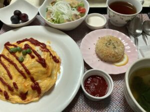 オムライス,さつまいものコロッケ,オータムサラダ,スープ&フルーツ