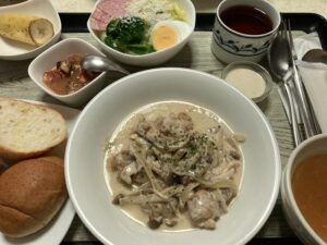 鶏ときのこのクリーム煮,ハムサラダ,スープ,パン&フルーツ