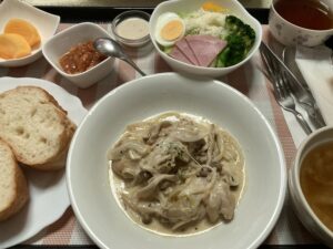 鶏ときのこのクリーム煮、ハムサラダ、すーぷ、パン(タコとトマトのブルスケッタ)&フルーツ