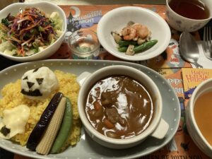 ビーフカレー&ハロウィン愉快なおばけライス、海老ときのこのローズマリー炒め、魔女の帽子~紫キャベツのラペ~、スープ