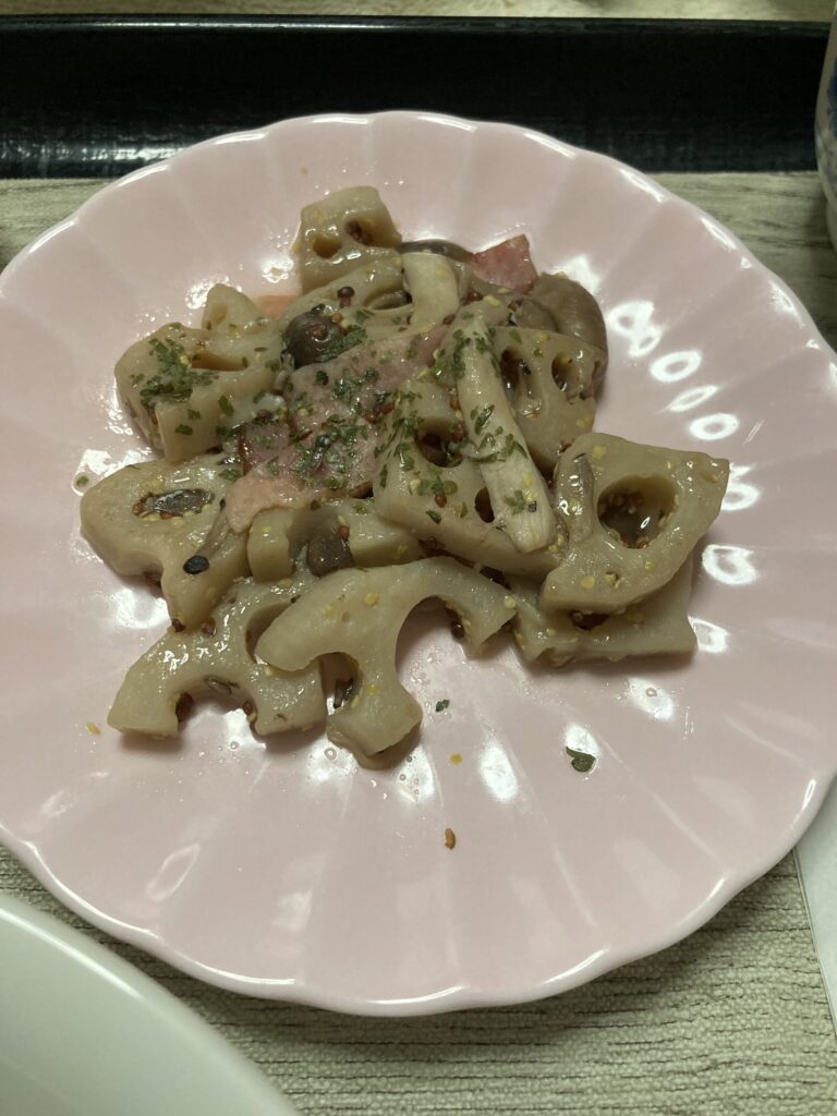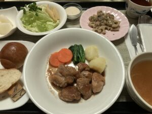 鶏肉のソテー 赤ワイン味噌ソース、れんこんとベーコンのマスタード炒め、スプラウトのサラダ、スープ、パン&フルーツ