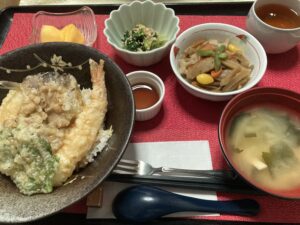 天丼、野菜の炒め吹き寄せ、青菜の胡麻酢和え、味噌汁&フルーツ