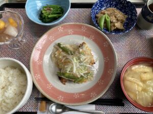 魚の塩麹銀あんかけ、れんこん挽肉煎り煮、青菜のお浸し、ご飯、味噌汁&デザート