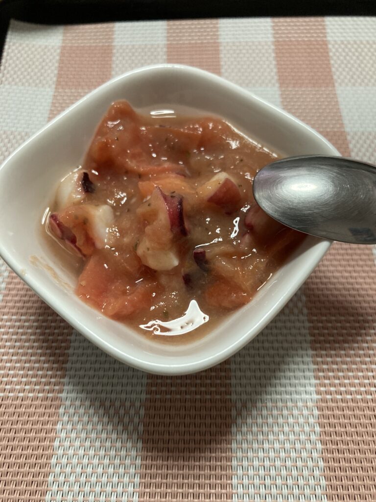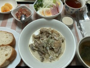 鶏ときのこのクリーム煮、ハムサラダ、スープ、パン(タコとトマトのブルスケッタ)&フルーツ