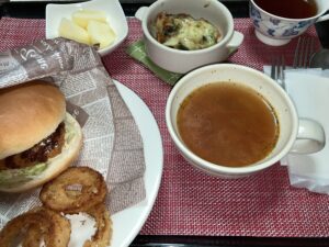 えびカツバーガー、オニオンフライ、鶏肉とかぼちゃのチーズ焼き、スープ&フルーツ