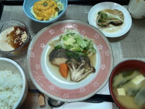 魚のさっぱり煮、茄子と鶏ひき肉の甘辛焼き、パンプキンサラダ、ごはん,味噌汁&デザート