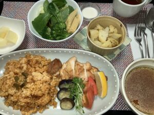 ケイジャンチキン&ジャンバラヤ,オーブンポテト、グリーンサラダ,スープ,フルーツ