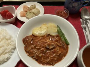 豚肉のデミきのこソース、海老とイカの唐揚げ サルサソース、スープ、ライス&フルーツ