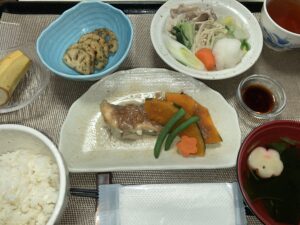 魚のくるみ味噌焼き、豚ばら肉と野菜蒸し、れんこんの青のり焼き、ご飯、お吸い物&フルーツ