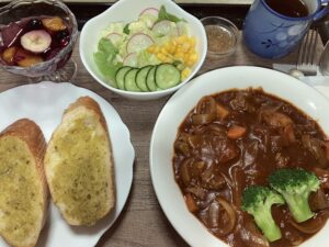 ビーフシチュー、コーンサラダ,バジルトースト&デザート