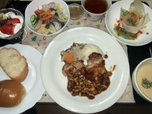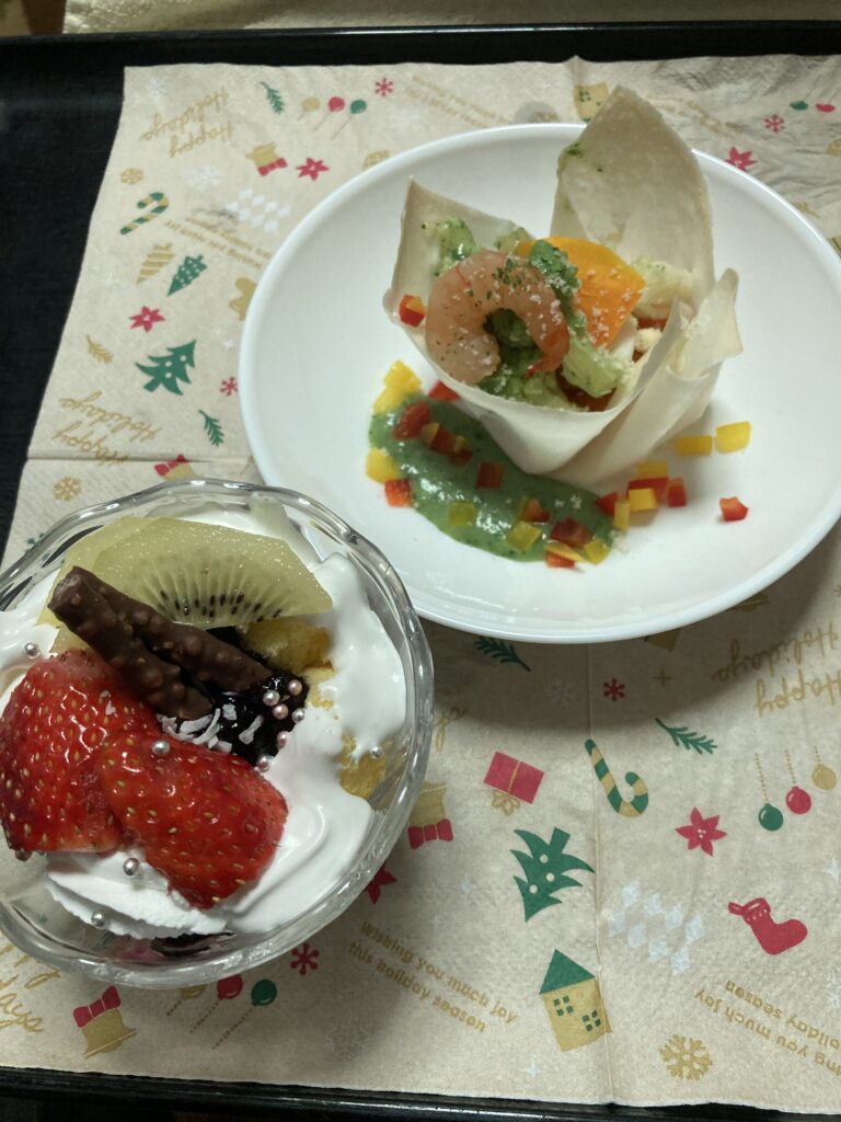 オードブル、さつまいもと林檎のポタージュ、クリスマスサラダ、鶏肉のハニーナッツソース、パン&デザート