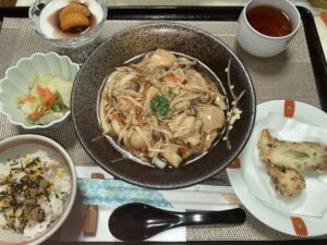 あんかけうどん、ちくわの磯辺揚げ、冬野菜の漬物、ミニご飯&デザート