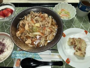 あんかけうどん、ちくわの磯辺揚げ、冬野菜の漬物、ミニご飯&デザート