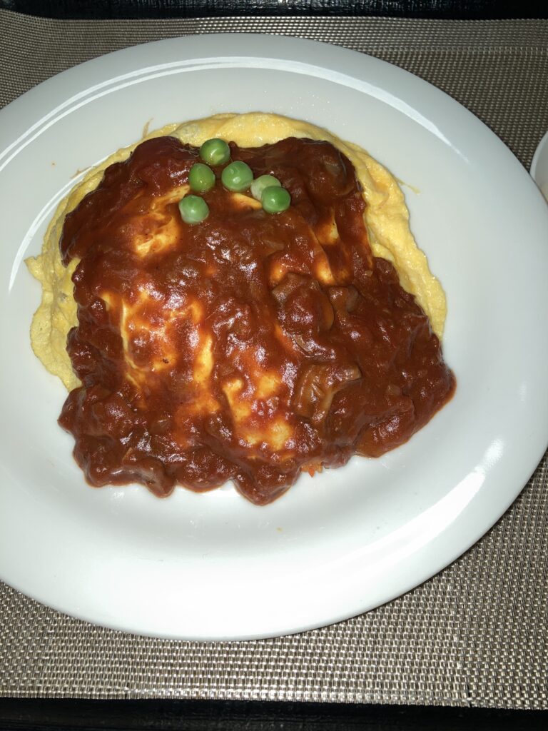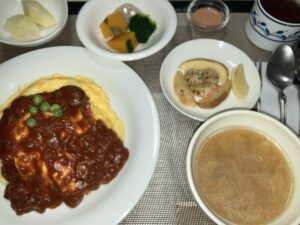 オムライスデミグラスソース、えびのスパイシーロースト、温野菜、スープ&フルーツ