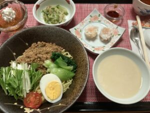 肉味噌豆乳坦々麺、えびシュウマイ、きゅうりと搾菜の和え物&デザート