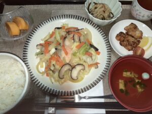 鮭のちゃんちゃん焼き、塩ザンギ、切干大根のはりはり漬、ご飯、お吸い物&フルーツ