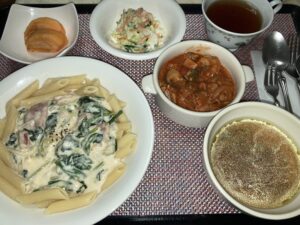 ほうれん草のチーズクリームパスタ、鶏肉の塩麹みそトマト込み、コールスローサラダ、スープ&フルーツ