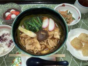 名古屋風味噌うどん、山椒風味のイカ天、三色和え、ミニご飯&デザート