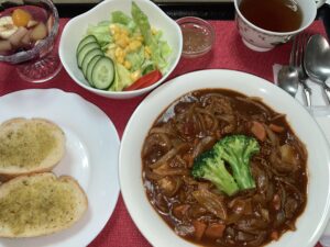ビーフシチュー、コーンサラダ、バジルトースト&デザート