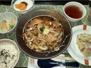 あんかけうどん、ちくわの磯辺揚げ、冬野菜の漬物、ミニご飯&デザート
