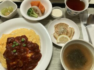 オムライス デミグラスソース、えびのスパイシーロースト、温野菜、スープ&フルーツ