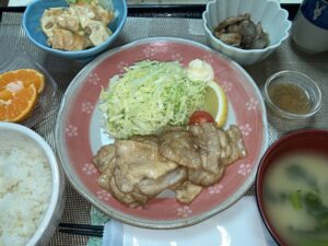 豚肉の生姜焼き、こんにゃくの当座煮、かぼちゃトマトれんこんのごまマヨ和え、ご飯、味噌汁&フルーツ
