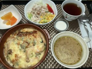 冬野菜のドリア、チキンサラダ、バジルスープ&フルーツ