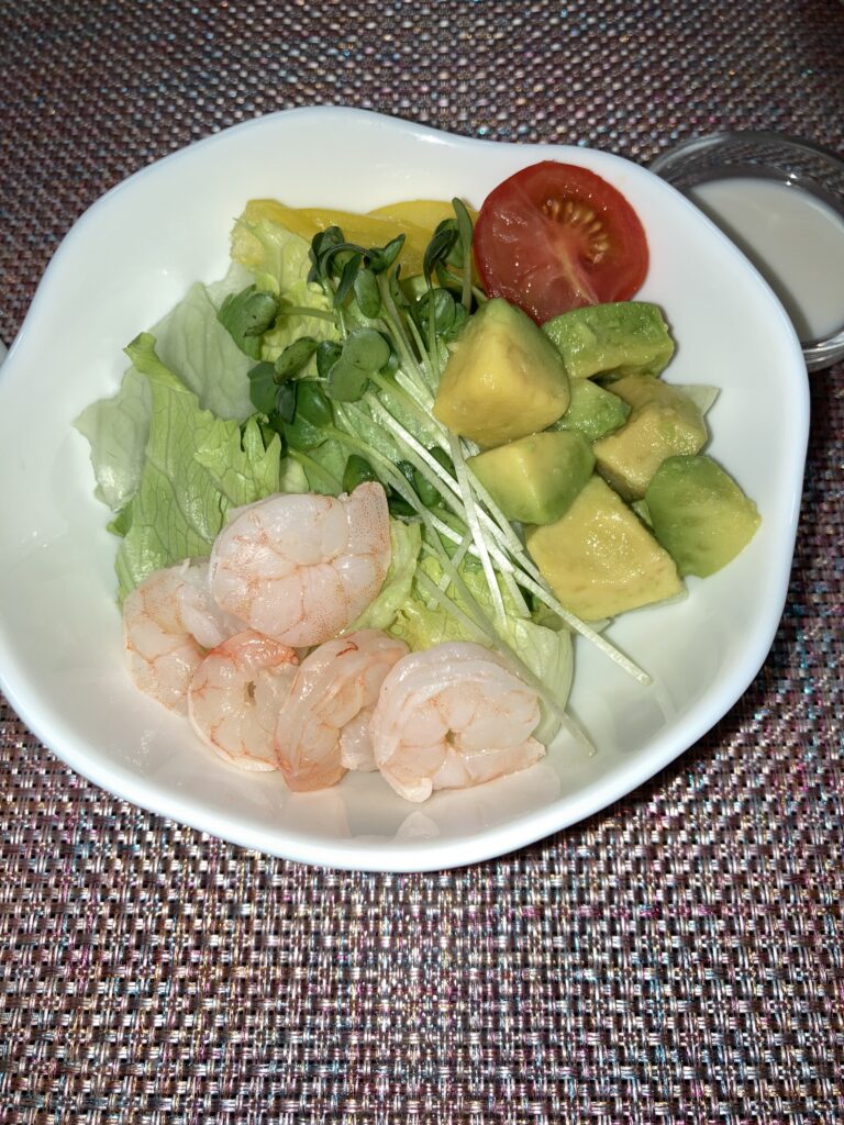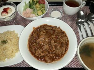 ハッシュドビーフ、ターメリックライス、海老とアボカドのサラダ、スープ&デザート