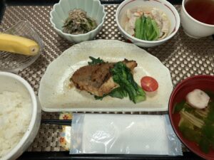 魚のごま味噌焼き、かぶと豚肉の旨塩煮、切干大根のゆかり和え、ご飯、お吸い物&フルーツ