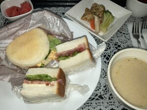 卵サラダとBLTサンド、鶏肉のマスタード焼き、スープ&フルーツ
