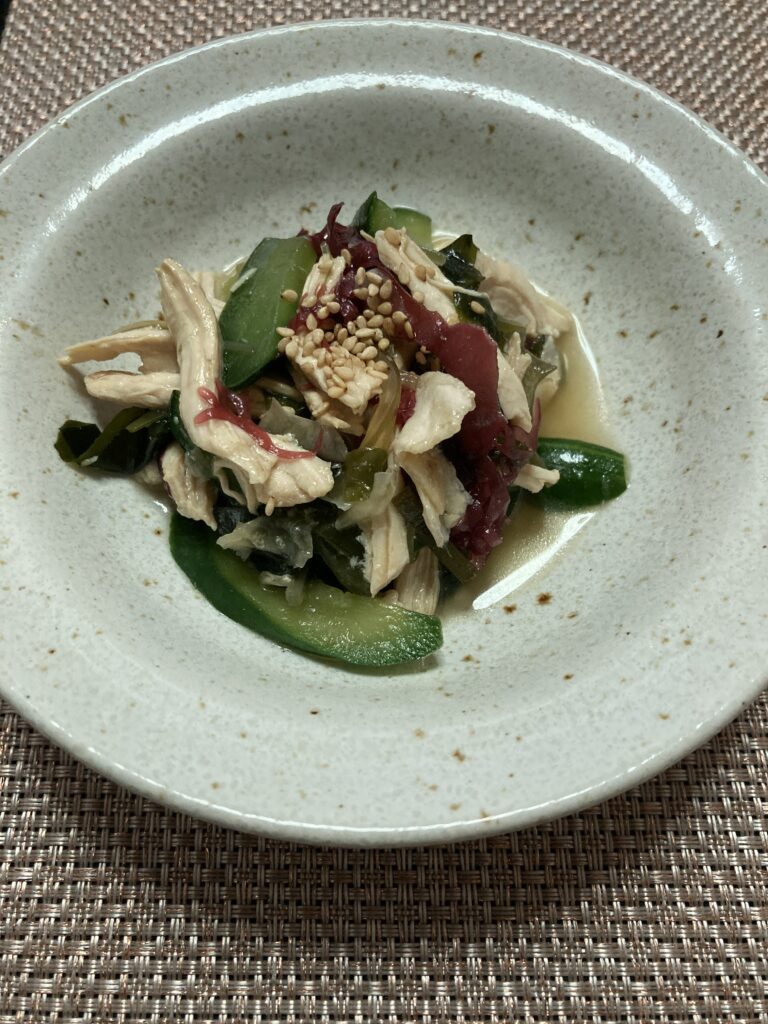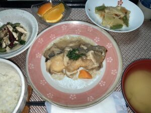 魚の梅おろし仕立て、彩り野菜のねぎ塩炒め、鶏肉と海藻のサラダ、ご飯、みそ汁&フルーツ