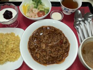 ハッシュドビーフとターメリックライス、えびとアボカドの野菜サラダ,スープ&デザート