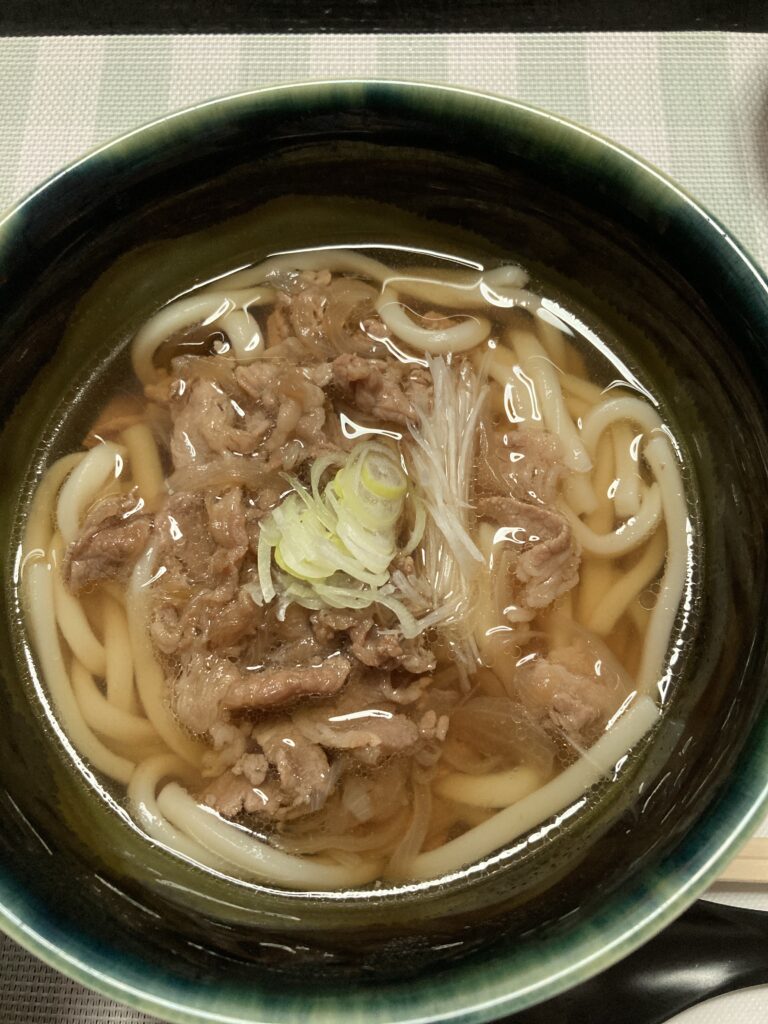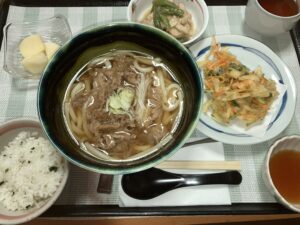 肉うどん、かき揚げ、高野豆腐の胡麻あんかけ、ミニご飯粒フルーツ