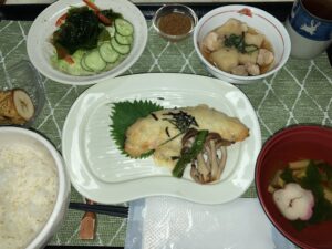 魚のねぎ味噌マヨネーズ焼き、じゃがいもの煮物 青じその香り、わかめサラダ、ご飯、お吸い物&フルーツ